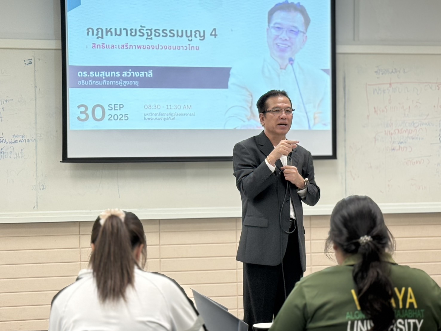 วันอังคารที่ 30 กันยายน พ.ศ. 2568 เวลา 08.30 น. นายธนสุนทร สว่างสาลี อธิบดีกรมกิจการผู้สูงอายุ เป็นวิทยากรบรรยาย เรื่อง ความรู้เกี่ยวกับกฎหมายรัฐธรรมนูญ คณะมนุษยศาสตร์และสังคมศาสตร์ มหาวิทยาลัยราชภัฏวไลยอลงกรณ์ในพระบรมราชูปถัมภ์ ณ ห้องเรียน SLB205 อาคารเรียนรวมสังคมศาสตร์ มหาวิทยาลัยราชภัฏวไลยอลงกรณ์ในพระบรมราชูปถัมภ์