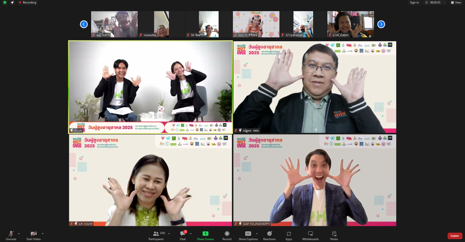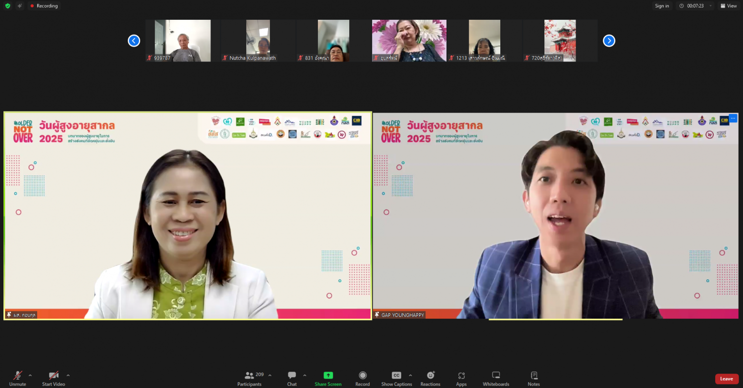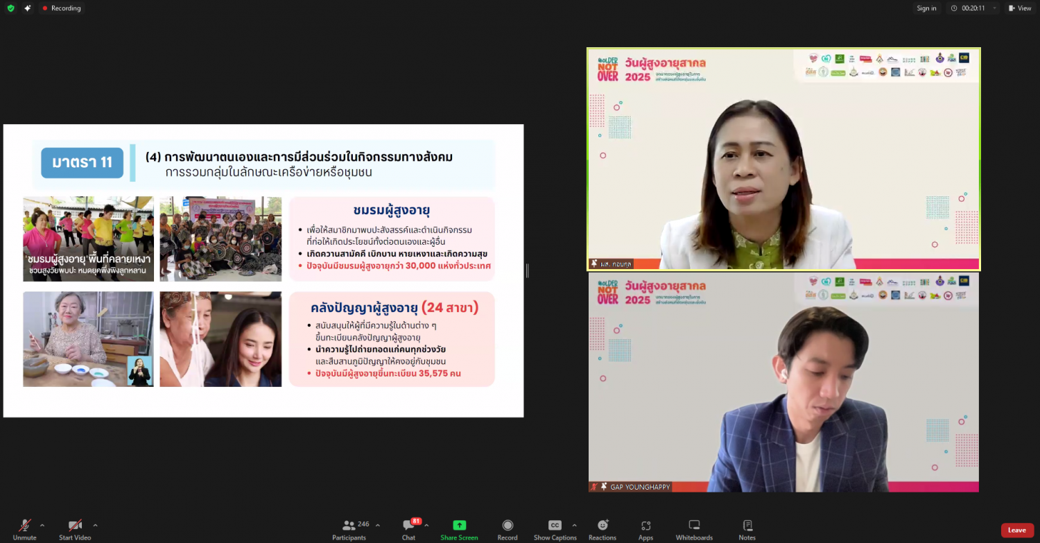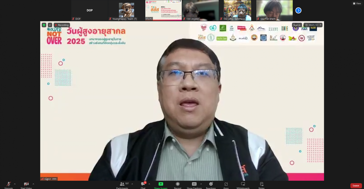 วันพุธที่ 1 ตุลาคม พ.ศ. 2568 เวลา 10.00 น. นางสาวกอบกุล กวั่งซ้วน ผู้เชี่ยวชาญเฉพาะด้านผู้สูงอายุ เป็นวิทยากรเสวนา หัวข้อ "สิทธิของผู้สูงอายุในปี 2025" ในงานวันผู้สูงอายุสากล 2025 ซึ่งจัดโดย สำนักงานกองทุนสนับสนุนการสร้างเสริมสุขภาพ (สสส.) ร่วมกับยังเเฮปปี้ ภายใต้แนวคิด "Older Not Over บทบาทของผู้สูงอายุในการสร้างสังคมที่ยืดหยุ่นและยั่งยืน" เพื่อให้ความรู้เกี่ยวกับการเข้ารับการบริการจากภาครัฐ การเข้าใช้สิทธิของผู้สูงอายุอย่างเข้าใจ และเข้าถึงด้วยการเสริมสร้างองค์ความรู้ผ่านข้อมูลสิทธิของผู้สูงอายุในปัจจุบัน ผ่านระบบออนไลน์ Zoom meeting ณ ห้องทำงานผู้เชี่ยวชาญเฉพาะด้านผู้สูงอายุ ชั้น 7 กรมกิจการผู้สูงอายุ