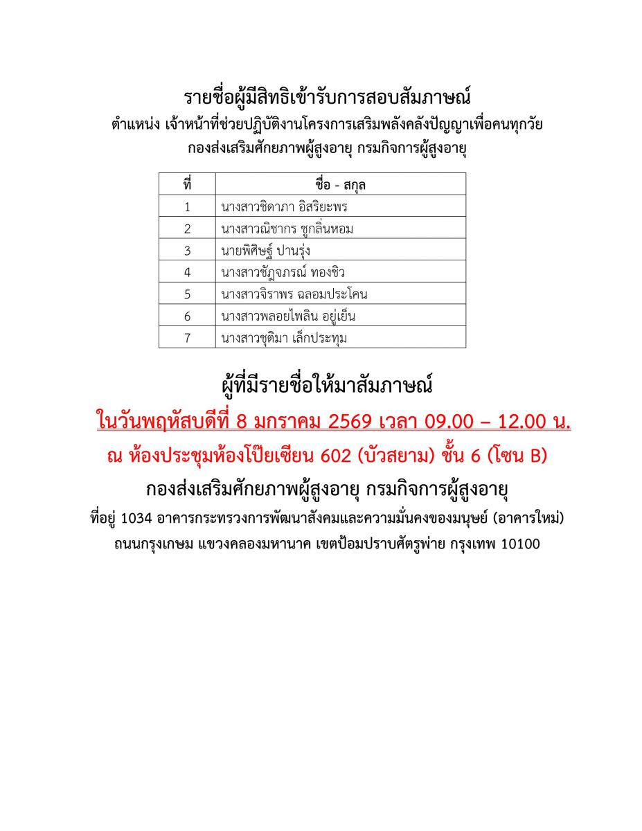 ประกาศรายชื่อผู้มีสิทธิเข้ารับการสัมภาษณ์ ตำแหน่งเจ้าหน้าที่ช่วยปฏิบัติงานโครงการเสริมพลังคลังปผัญญาเพื่อพัฒนาคนทุกช่วงวัย
