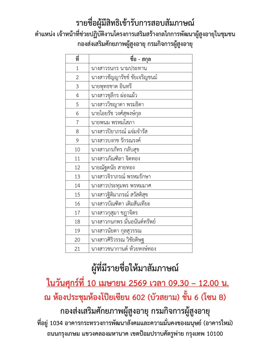 ประกาศรายชื่อผู้มีสิทธิเข้ารับการสอบสัมภาษณ์ ตำแหน่ง เจ้าหน้าที่ช่วยปฏิบัติงานโครงการเสริมสร้างกลไกการพัฒนาผู้สูงอายุในชุมชชน ในวันที่ 10 เมษายน 2569 เวลา 09.30 น.กองส่งเสริมศักยภาพผู้สูงอายุ กรมกิจก