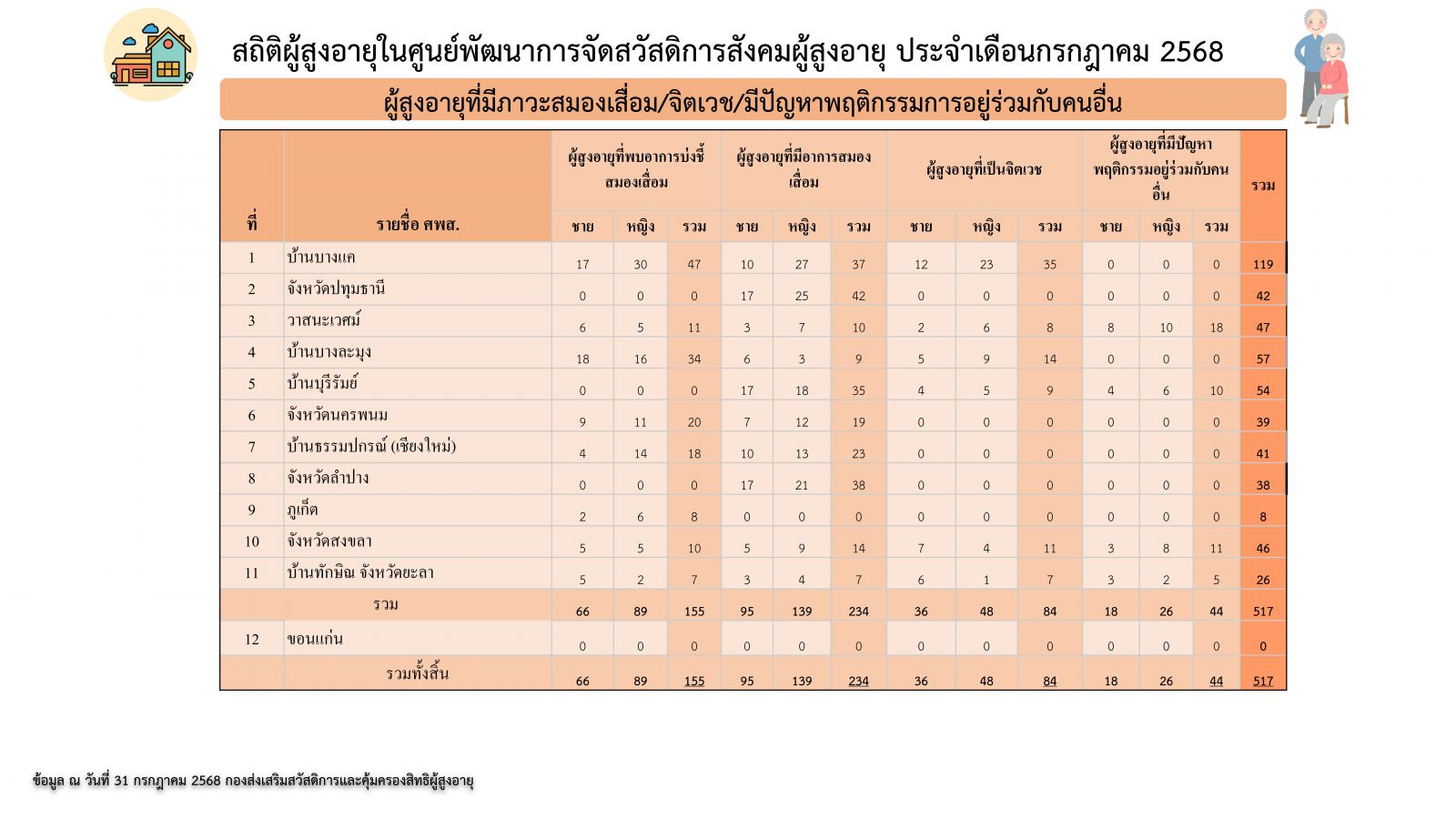- สถิติผู้สูงอายุผู้ใช้บริการภายในศูนย์พัฒนาการสวัสดิการสังคมผู้สูงอายุ ประจำเดือนกรกฎาคม 2568