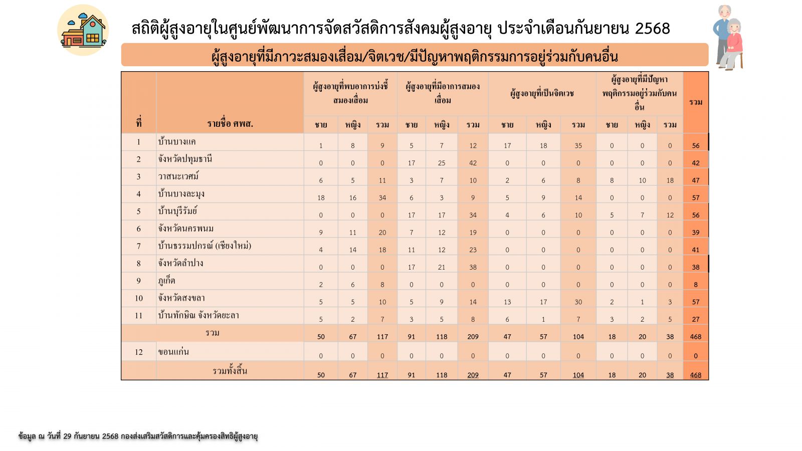 สถิติผู้สูงอายุผู้ใช้บริการภายในศูนย์พัฒนาการสวัสดิการสังคมผู้สูงอายุ ประจำเดือนกันยายน 2568