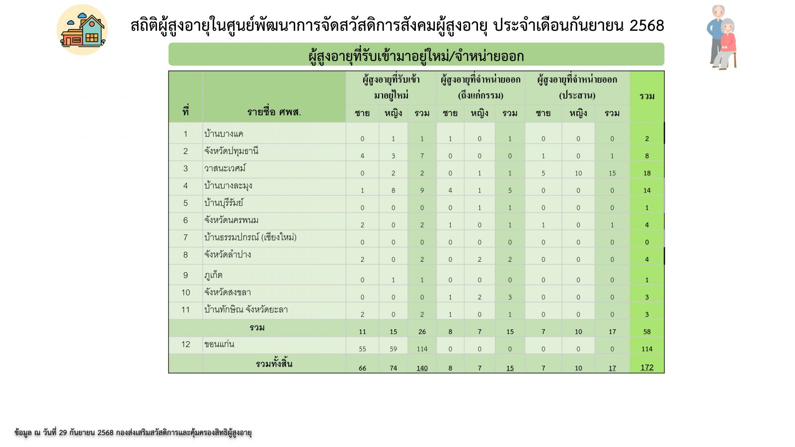 ผู้สูงอายุผู้ใช้บริการภายในศูนย์พัฒนาการจัดสวัสดิการสังคมผู้สูงอายุ สถิติผู้สูงอายุผู้ใช้บริการภายในศูนย์พัฒนาการสวัสดิการสังคมผู้สูงอายุ ประจำเดือนกันยายน 2568