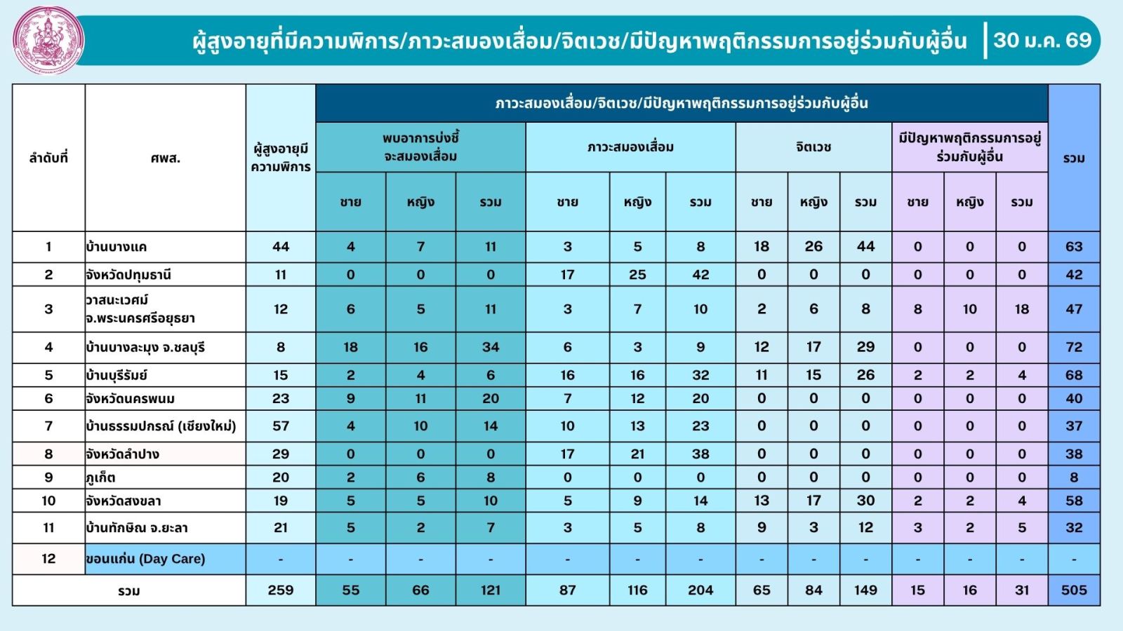 - สถิติผู้สูงอายุในศูนย์พัฒนาการจัดสวัสดิการสังคมผู้สูงอายุ เดือนมกราคม 2569