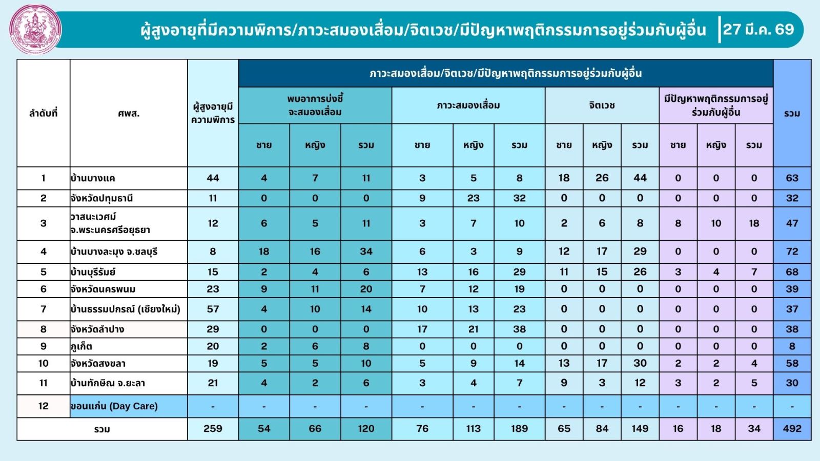 - สถิติผู้สูงอายุในศูนย์พัฒนาการจัดสวัสดิการสังคมผู้สูงอายุ เดือนมีนาคม 2569
