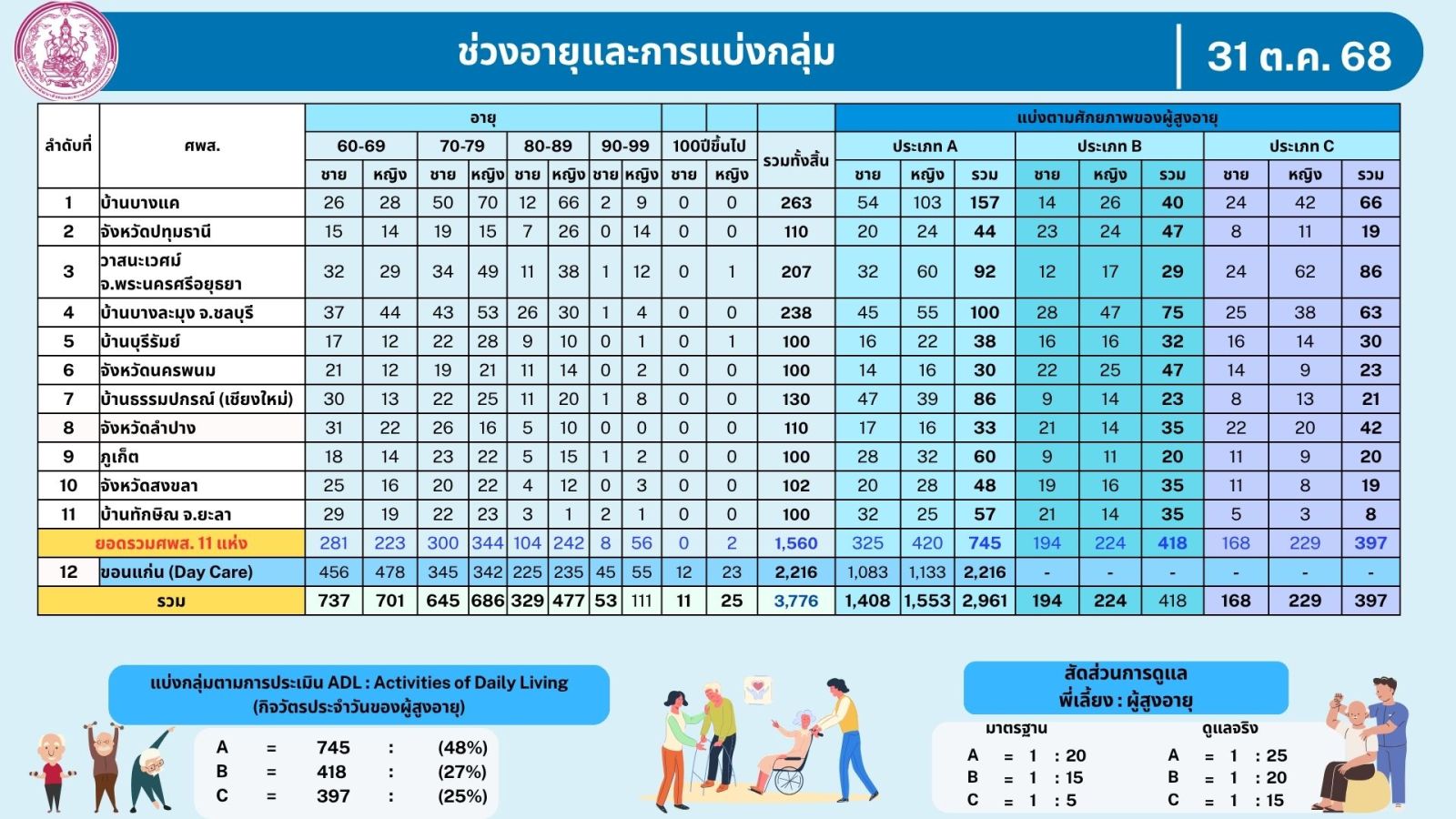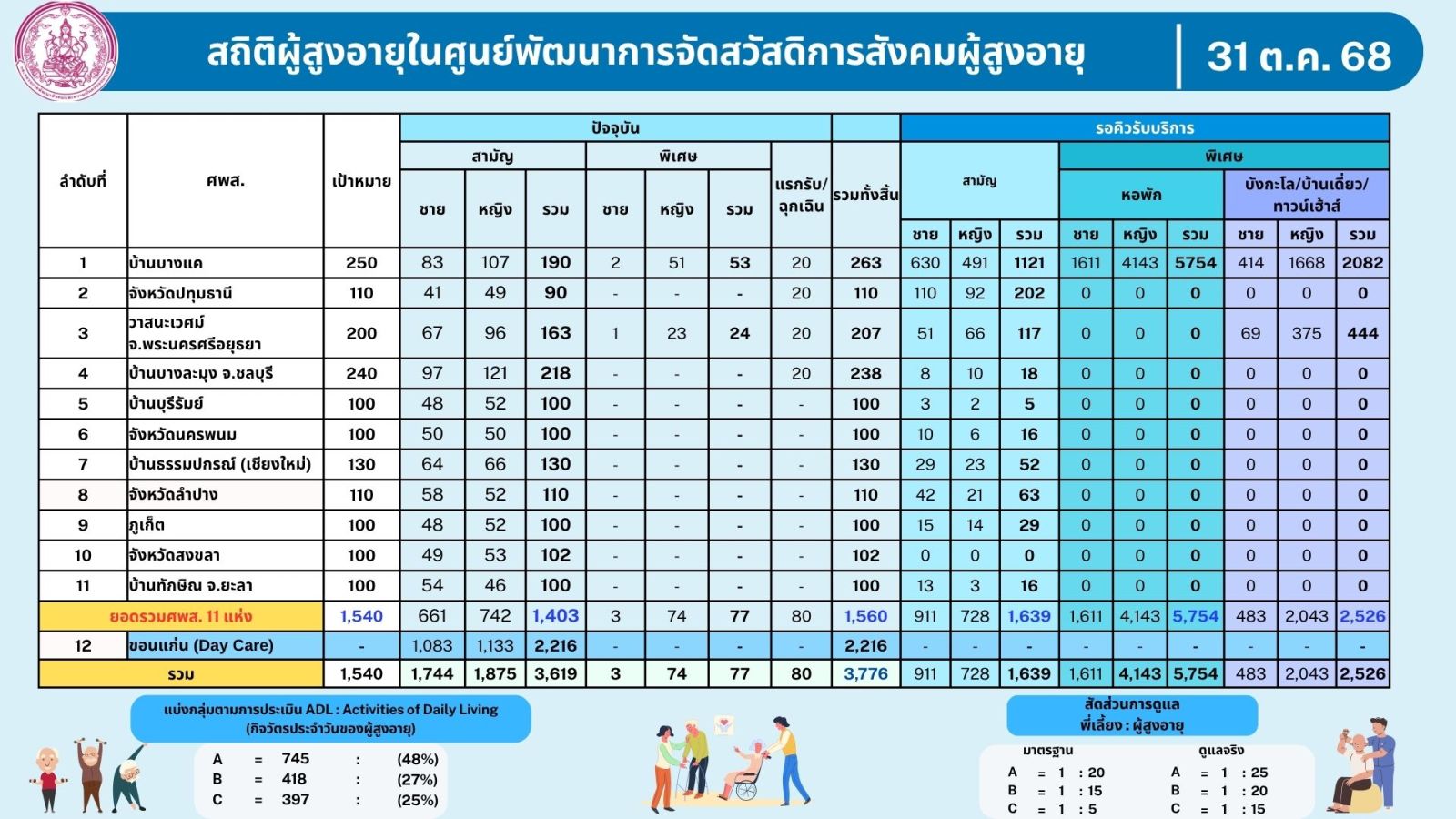 - สถิติผู้สูงอายุในศูนย์พัฒนาการจัดสวัสดิการสังคมผู้สูงอายุ เดือนตุลาคม 2568