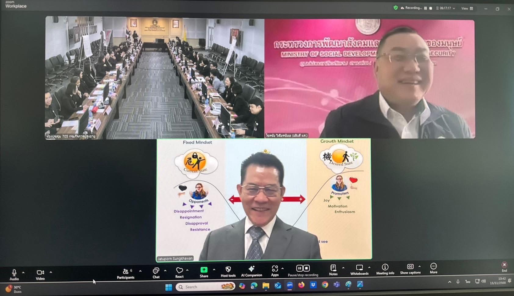 วันเสาร์ที่ 15 พฤศจิกายน พ.ศ. 2568 นายโชคชัย วิเชียรชัยยะ อธิบดีกรมกิจการผู้สูงอายุ เป็นประธานในพิธีเปิดโครงการเพิ่มประสิทธิภาพผู้บริหารสู่การหลอมรวมทีมงาน "New Leader Assimilation" ผ่านระบบ Zoom Meeting โดยมีนางวรรณภา สุขคง นางวาสนา ทองจันทร์ รองอธิบดีกรมกิจการผู้สูงอายุ ผู้อำนวยการกอง/หัวหน้ากลุ่ม/ผู้อำนวยการศูนย์พัฒนาการจัดสวัสดิการสังคมผู้สูงอายุบ้านบางแค ผู้อำนวยการศูนย์พัฒนาการจัดสวัสดิการสังคม ผู้สูงอายุจังหวัดปทุมธานี และผู้อำนวยการกลุ่ม สังกัดกรมกิจการผู้สูงอายุ รวมจำนวน 31 คน ณ ห้องประชุมโป๊ยเซียน 705 ทรัพย์เจริญสุข ชั้น 7 กรมกิจการผู้สูงอายุ กระทรวง พม.