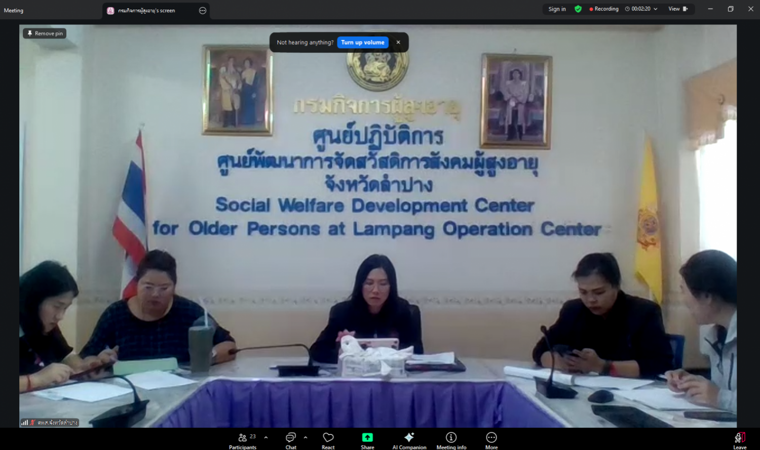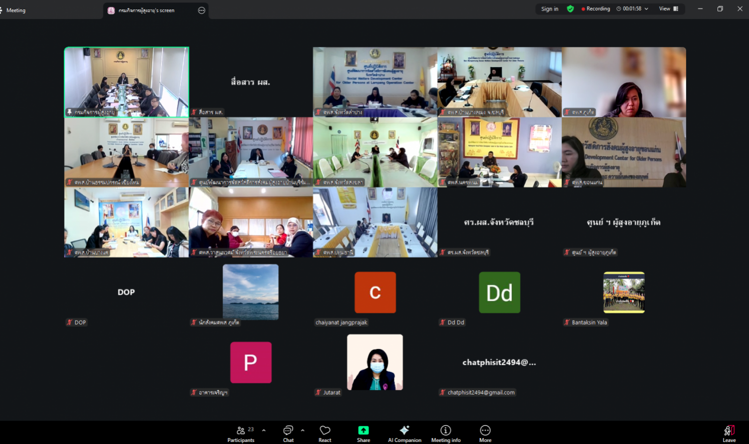 ในการนี้ มีนางพัชรมณฑ์ ปิติปัญญากุล ผู้อำนวยการกองส่งเสริมสวัสดิการและคุ้มครองสิทธิผู้สูงอายุ นางสาวอัญชลี จิตรเสนาะ ผู้อำนวยการกองส่งเสริมศักยภาพผู้สูงอายุ พร้อมด้วยผู้อำนวยการศูนย์พัฒนาการจัดสวัสดิการสังคมผู้สูงอายุทั้ง 12 แห่ง ผู้อำนวยการศูนย์การเรียนรู้และฝึกอบรมด้านผู้สูงอายุ จังหวัดชลบุรี ข้าราชการ และเจ้าหน้าที่กรมกิจการผู้สูงอายุ เข้าร่วมประชุม ณ ห้องประชุมโป๊ยเซียน 706 มงกุฎทอง ชั้น 7 กรมกิจการผู้สูงอายุ กระทรวงการพัฒนาสังคมและความมั่นคงของมนุษย์ และผ่านระบบออนไลน์ Zoom Meeting