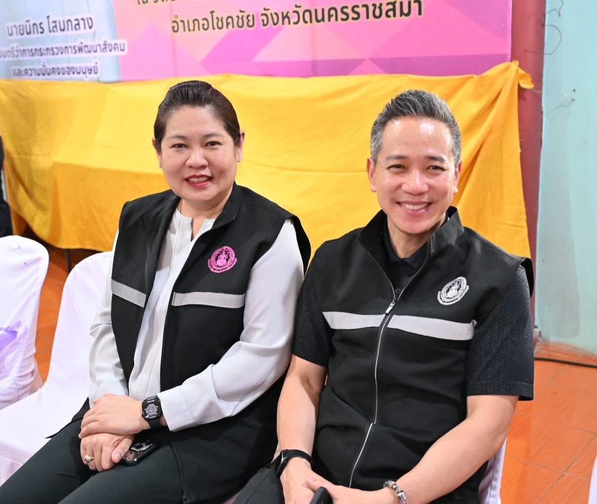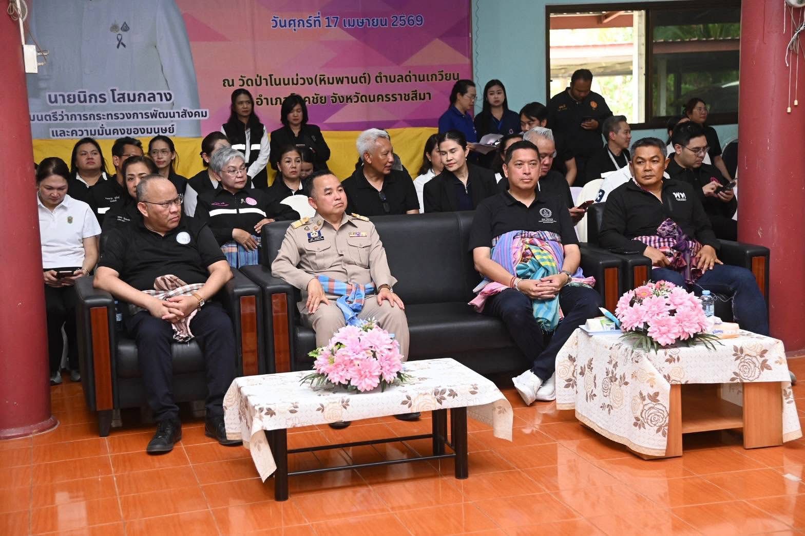 วันพฤหัสบดีที่ 17 เมษายน พ.ศ. 2569 เวลา 15.00 น. นายนิกร โสมกลาง รัฐมนตรีว่าการกระทรวงการพัฒนาสังคมและความมั่นคงของมนุษย์ (รมว.พม.) ลงพื้นที่จังหวัดนครราชสีมา เพื่อขับเคลื่อนงานพัฒนาคุณภาพชีวิตกลุ่มเป้าหมายทุกช่วงวัยในระดับจังหวัด ณ วัดป่าโนนม่วง (หิมพานต์) หมู่ที่ 10 บ้านหนองสระธาร ตำบลด่านเกวียน อำเภอโชคชัย โดยรับฟังสรุปภาพรวมการดำเนินงานของขบวนองค์กรชุมชนและกองทุนสวัสดิการชุมชนในพื้นที่จังหวัดนครราชสีมา พร้อมมอบงบประมาณสมทบกองทุนสวัสดิการชุมชนในพื้นที่อำเภอโชคชัย จากสถาบันพัฒนาองค์กรชุมชน (องค์การมหาชน) หรือ พอช. มอบถุงยังชีพและเครื่องอุปโภคบริโภคที่จำเป็นแก่กลุ่มเปราะบาง มอบกุญแจบ้านในโครงการพัฒนาที่อยู่อาศัย จำนวน 22 หลัง จากการเคหะแห่งชาติ (กคช.) มอบเงินกู้ยืมคนพิการต้นแบบเพื่อเป็นทุนประกอบอาชีพ จากกองทุนส่งเสริมและพัฒนาคุณภาพชีวิตคนพิการ กรมส่งเสริมและพัฒนาคุณภาพชีวิตคนพิการ (พก.) มอบป้ายบ้านคนพิการและผู้สูงอายุที่ได้รับงบประมาณซ่อมแซมปรับปรุงให้มีความเหมาะสมและปลอดภัย จากกรมกิจการผู้สูงอายุ (ผส.) และกรม พก. มอบเงินอุดหนุนเงินสงเคราะห์ครอบครัว จำนวน 47 ราย จากกรมกิจการสตรีและสถาบันครอบครัว (สค.) มอบเงินสงเคราะห์เด็กในครอบครัว จำนวน 19 ราย จากกรมกิจการเด็กและเยาวชน (ดย.) มอบเงินช่วยเหลือผู้ประสบปัญหากรณีฉุกเฉิน จำนวน 10 ราย และมอบเงินอุดหนุนโครงการกองทุนส่งเสริมการจัดสวัสดิการสังคมในพื้นที่อำเภอโชคชัย